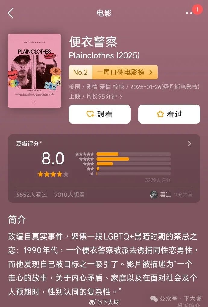 本月,豆瓣电影一周口碑榜上有一部同性题材的电影——《便衣警察》(Plainclothes)引起了许多基友的关注,它根据真实故事改编,在豆瓣电影获得了7.9分(之前8分)的好评。