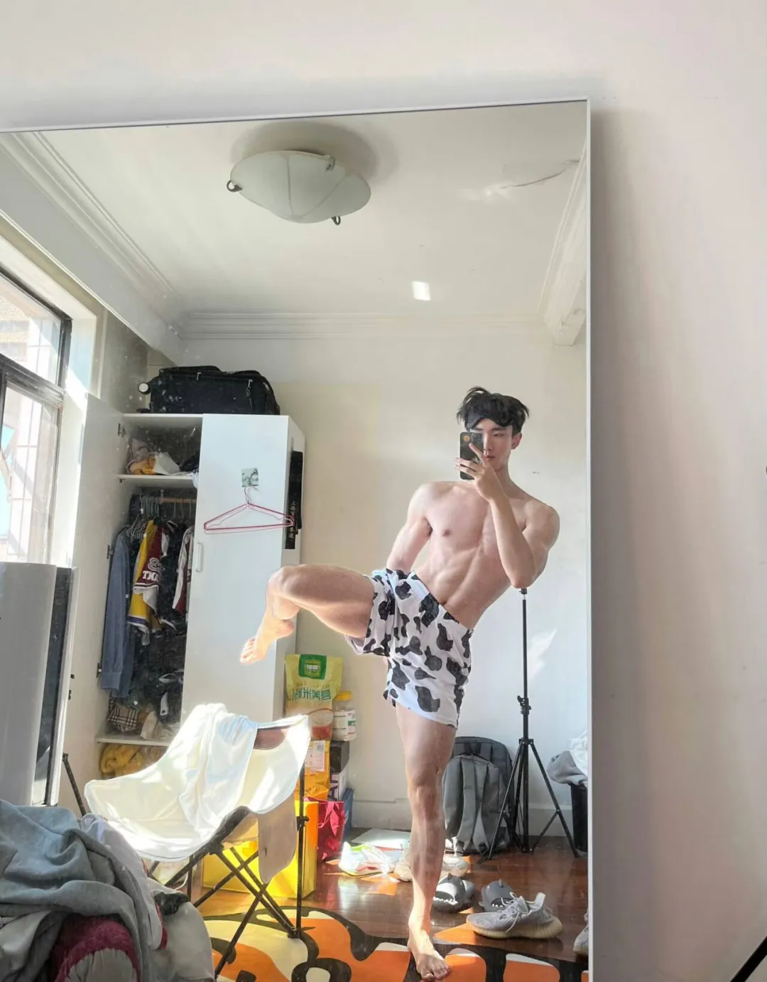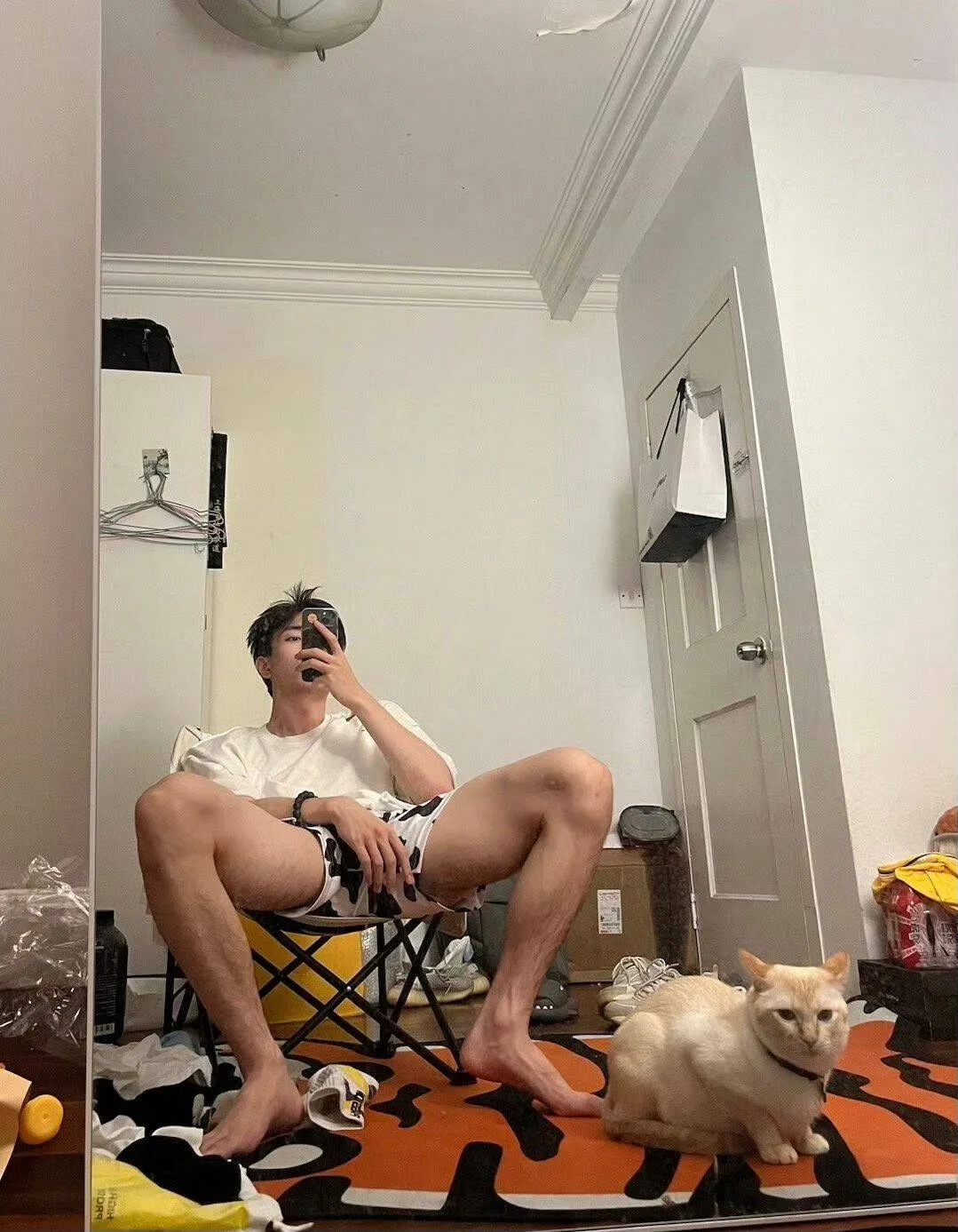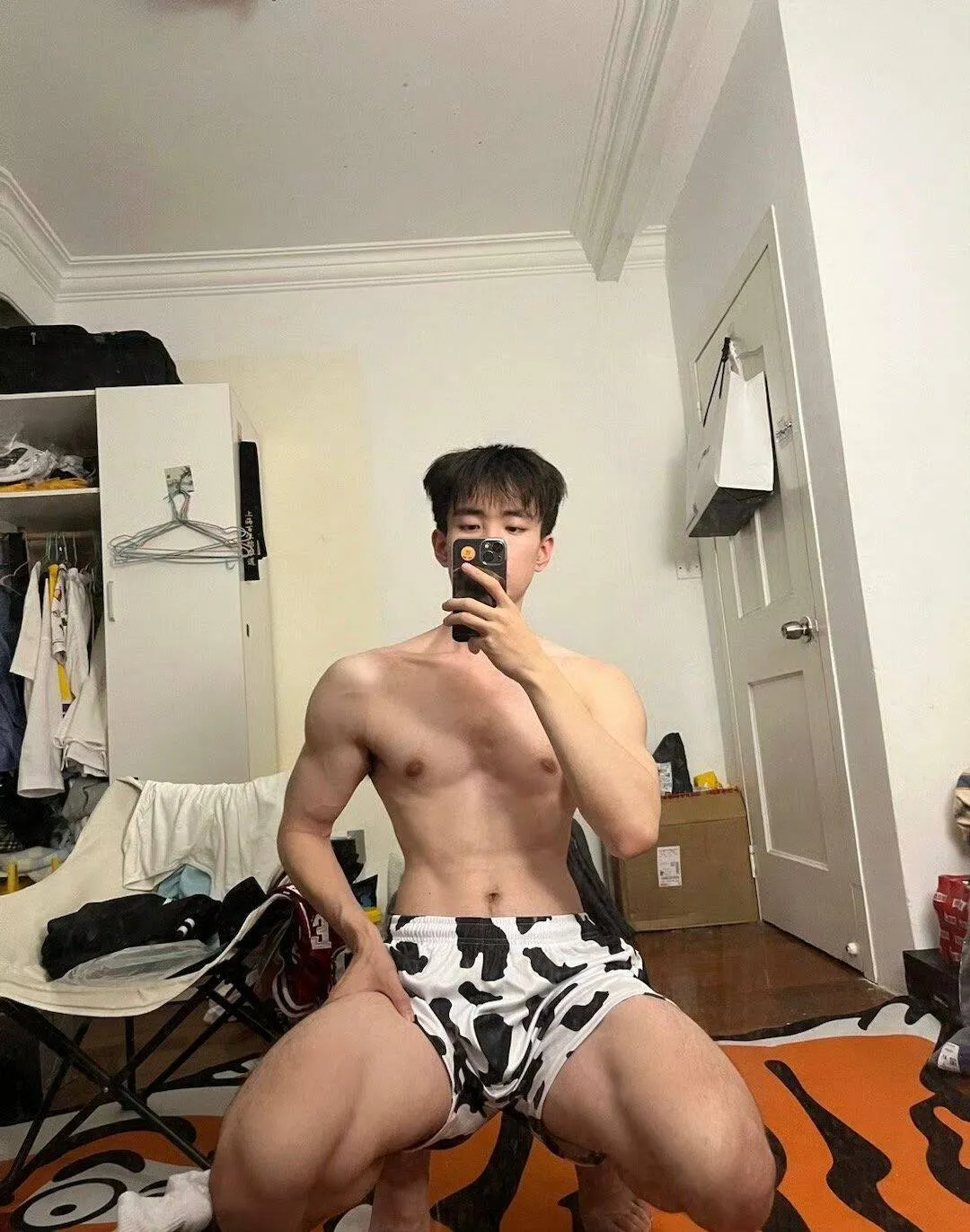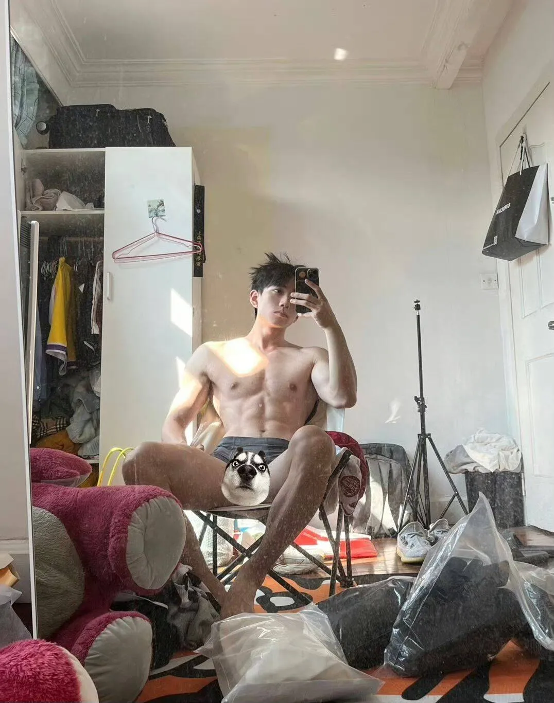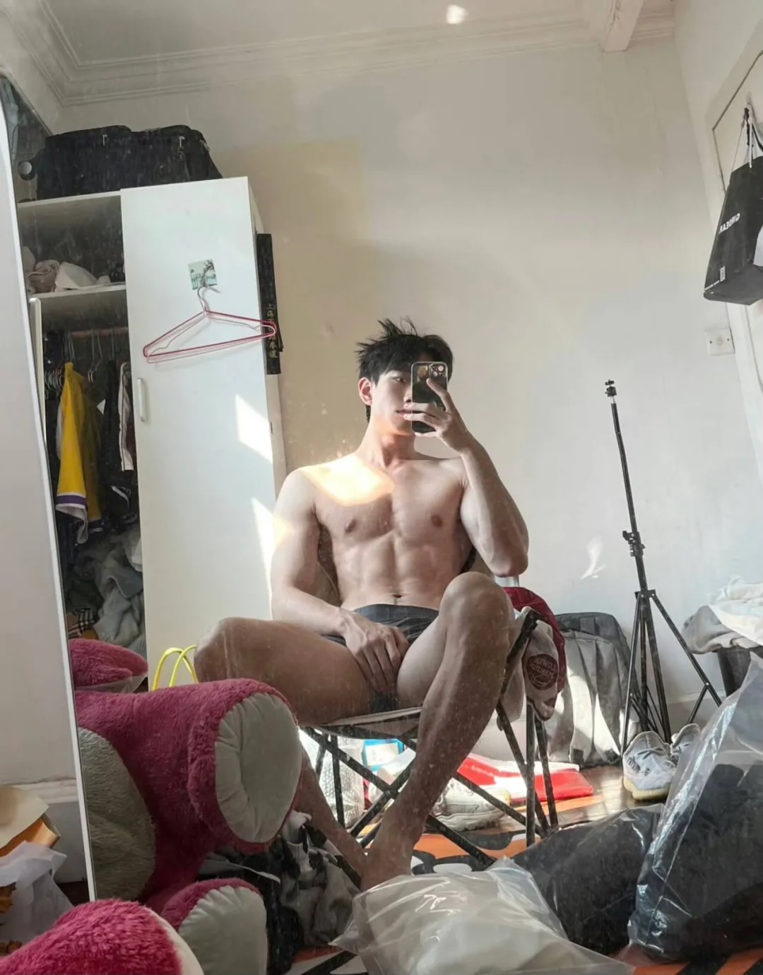 只要稍微用力一收腹,那复合着青春气息的体格就会立马展现出凹凸有致、性感至极的腹肌线条。我真希望自己就是小哥身边那只幸运的小猫猫,整日能贴着他结实火辣的肌理打盹啊!