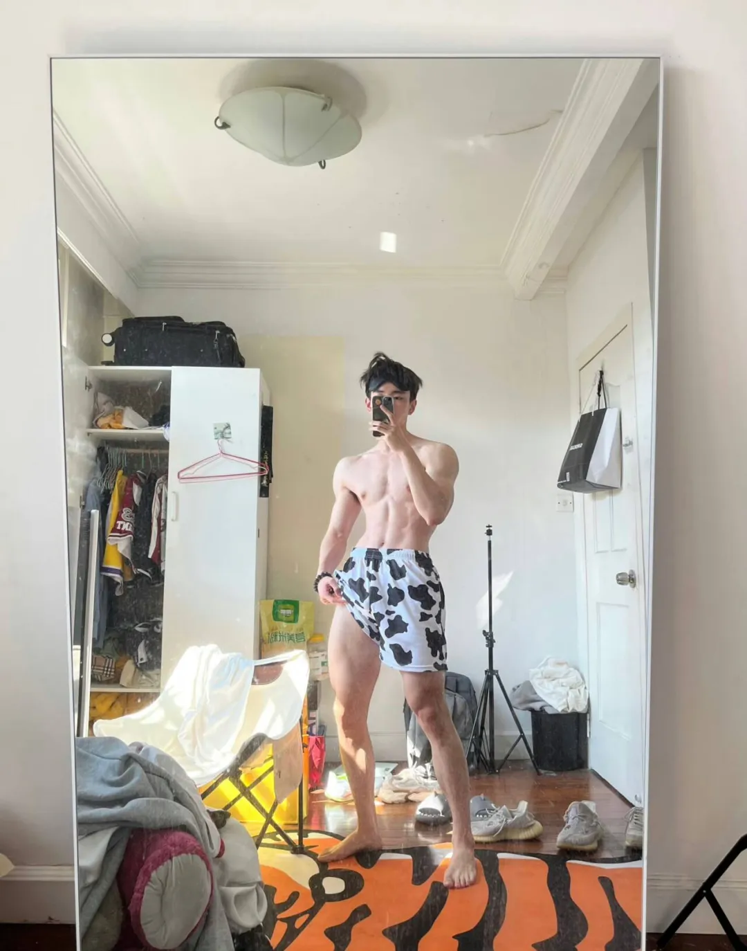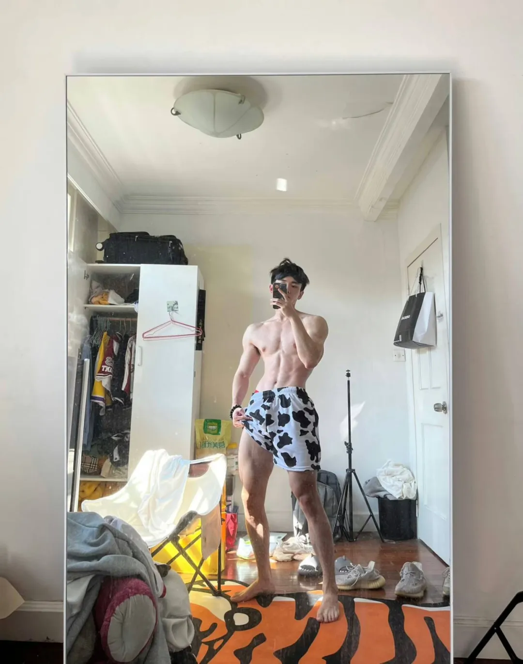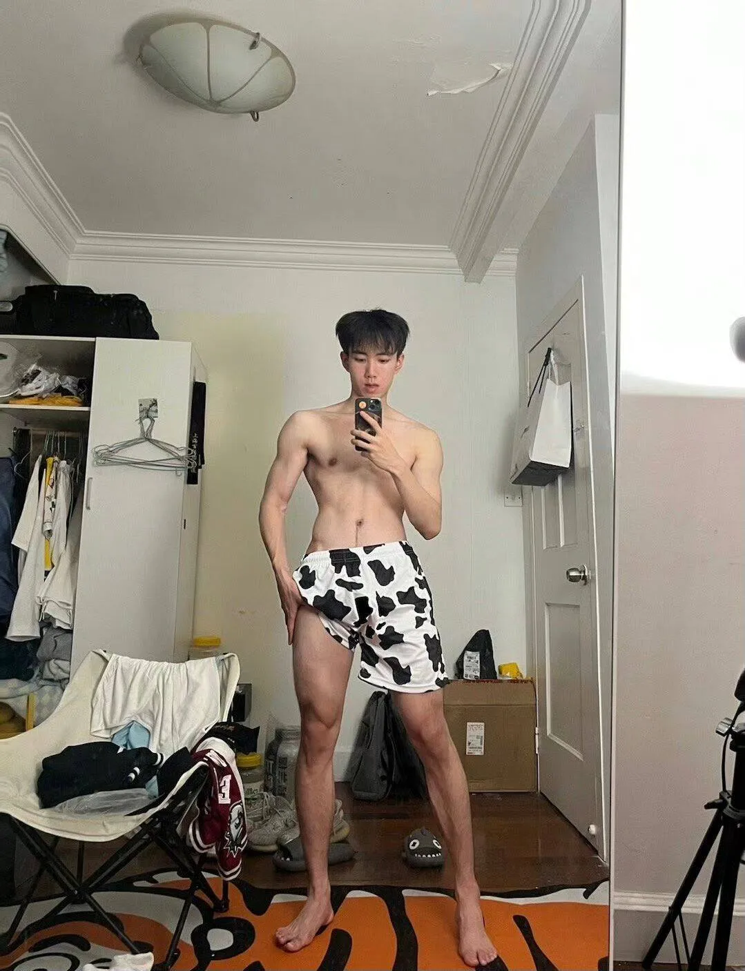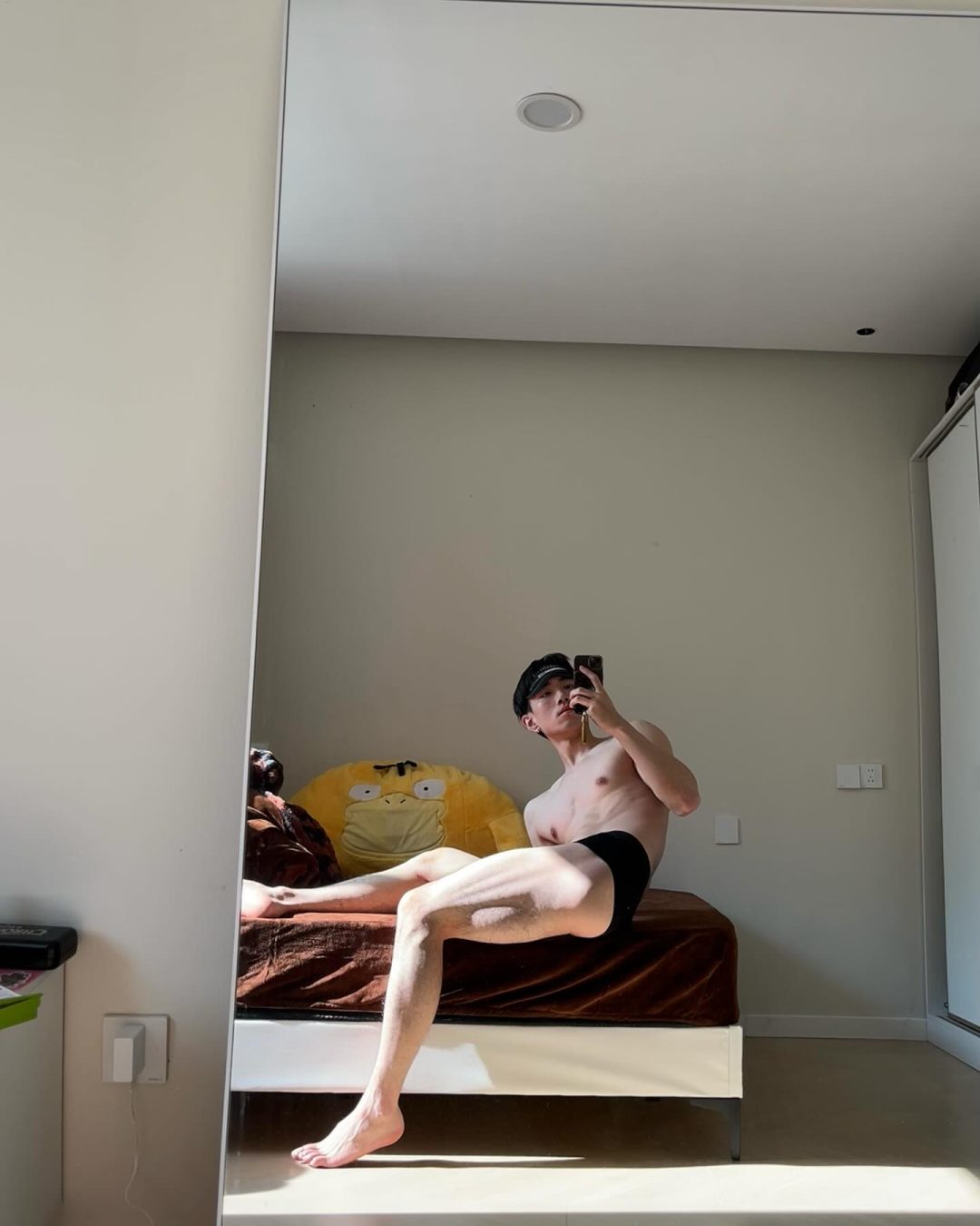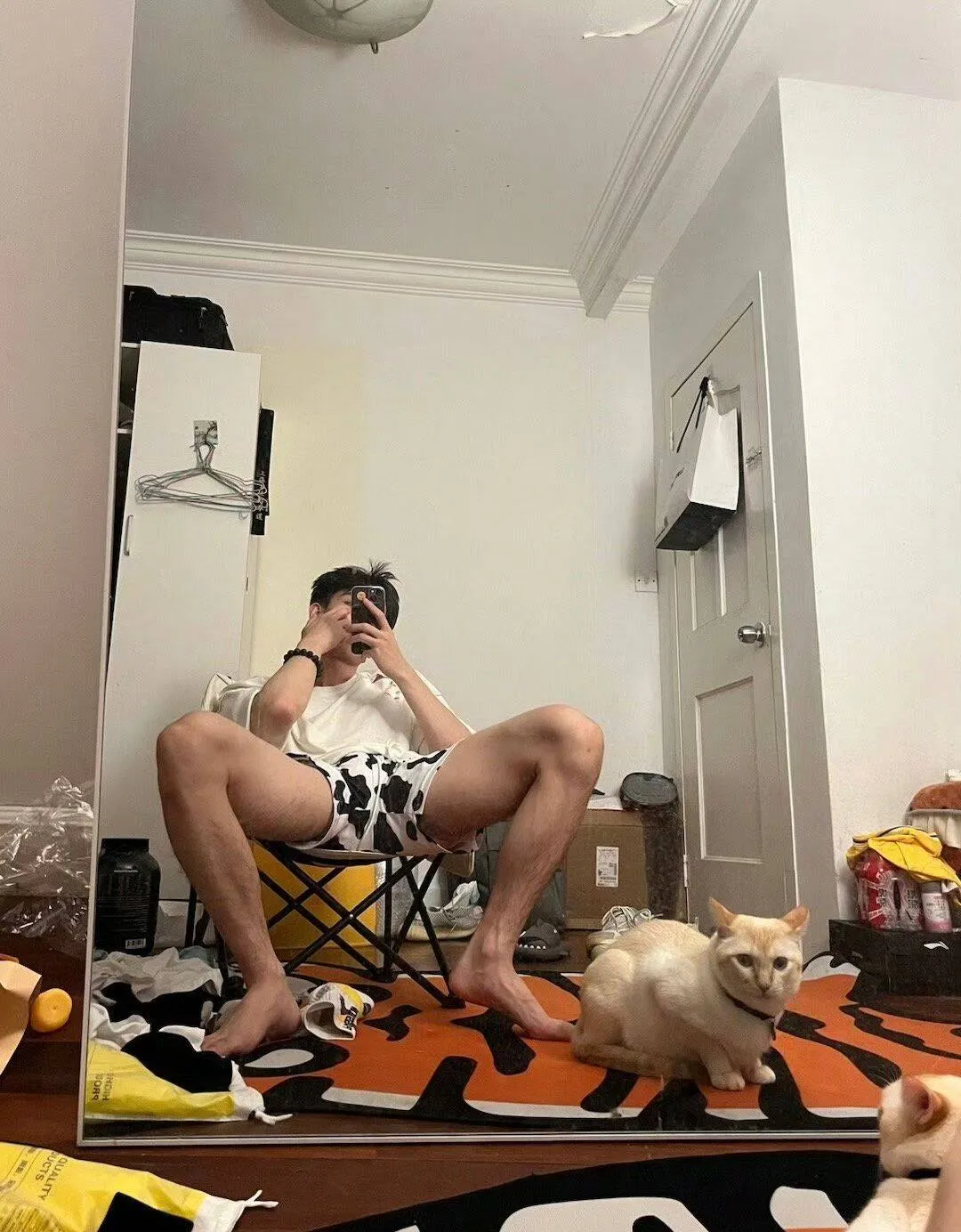 只要稍微用力一收腹,那复合着青春气息的体格就会立马展现出凹凸有致、性感至极的腹肌线条。我真希望自己就是小哥身边那只幸运的小猫猫,整日能贴着他结实火辣的肌理打盹啊!