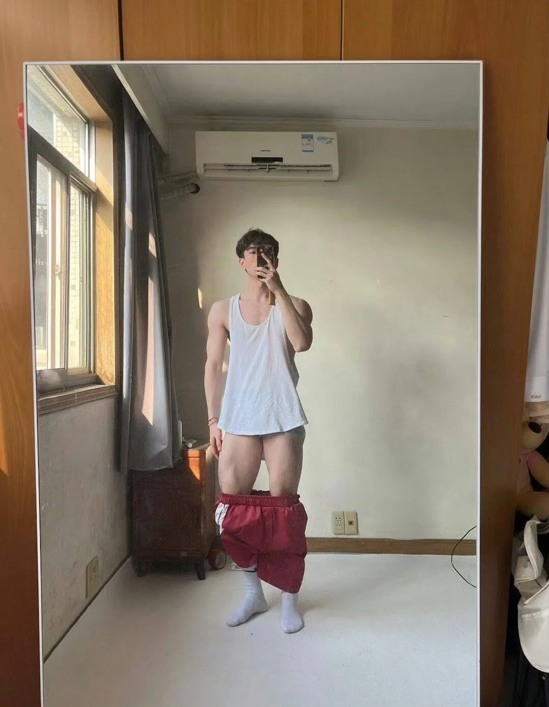 除了腹肌雪白匀称之外,可能你们最馋他的就要数那双夸张的大白腿了! 这双粗壮的大腿上那根根纤细却格外性感的肌肉线条,再加上小伙儿白到发亮的皮肤,完全就是极品体育生的代表作嘛!