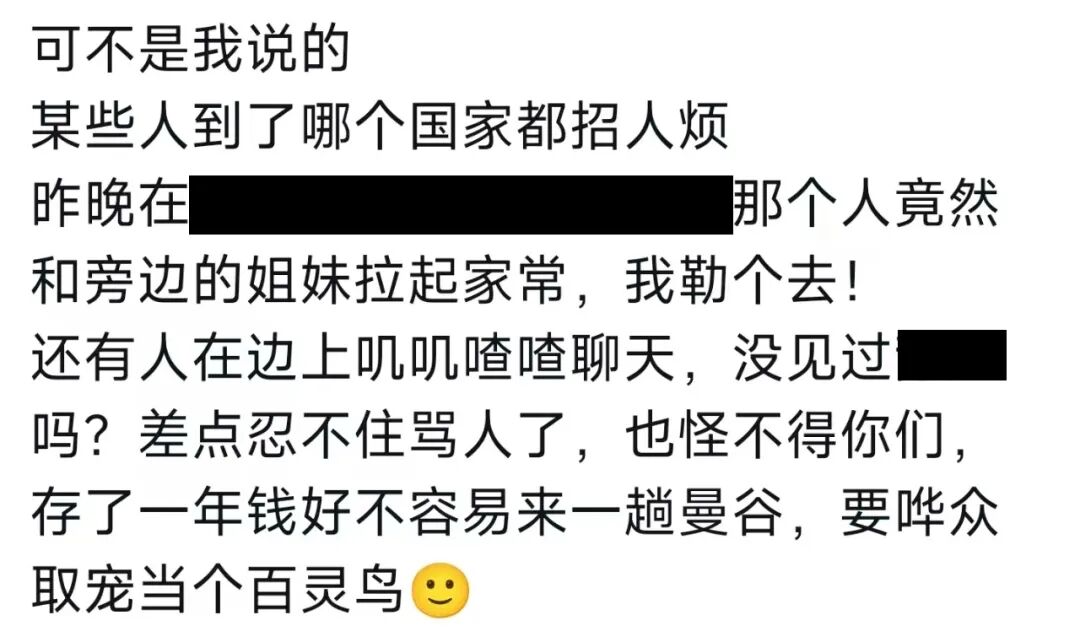 该基友愤怒地说,“还有人在边上叽叽喳喳地聊天,我差点忍不住骂人了,也怪不得你们,存了一年的钱好不容易来一趟曼谷,要哗众取宠当个百灵鸟。”从这段话就可以看出来,该基友当时有多生气,也可以看得出来这个基友绝对不是省油的灯,他骂人不带脏字,说话可谓是相当毒舌。