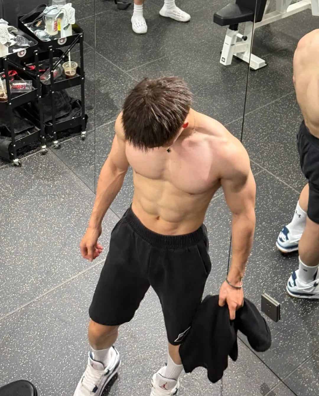关键是他那鲨鱼肌线条!像刀刻一样清晰,顺着腰线往下看直接惊到 —— 冷白皮在阳光下都透着清透感,随便穿件紧身健身衣都能把身材优势拉满