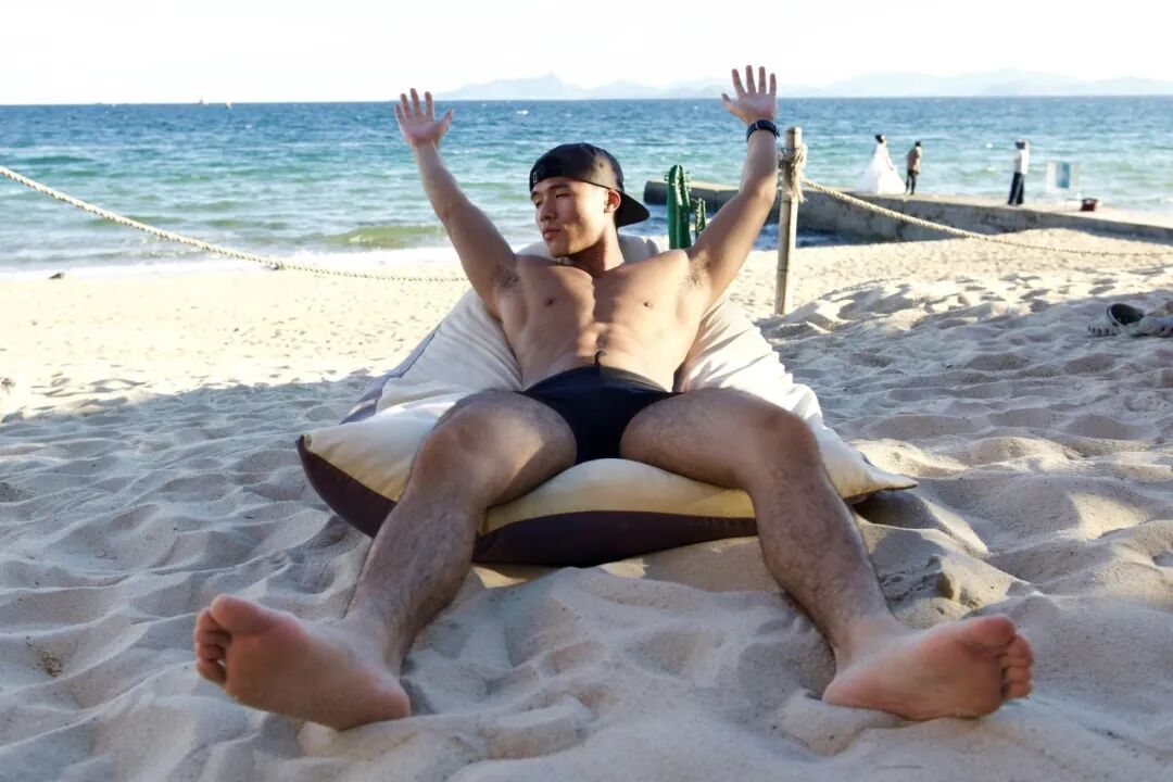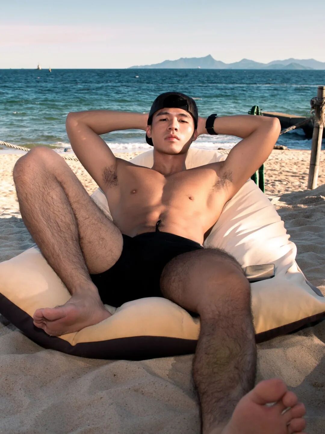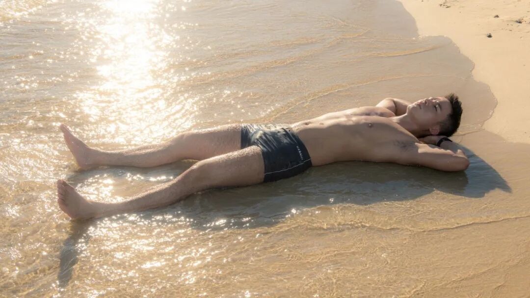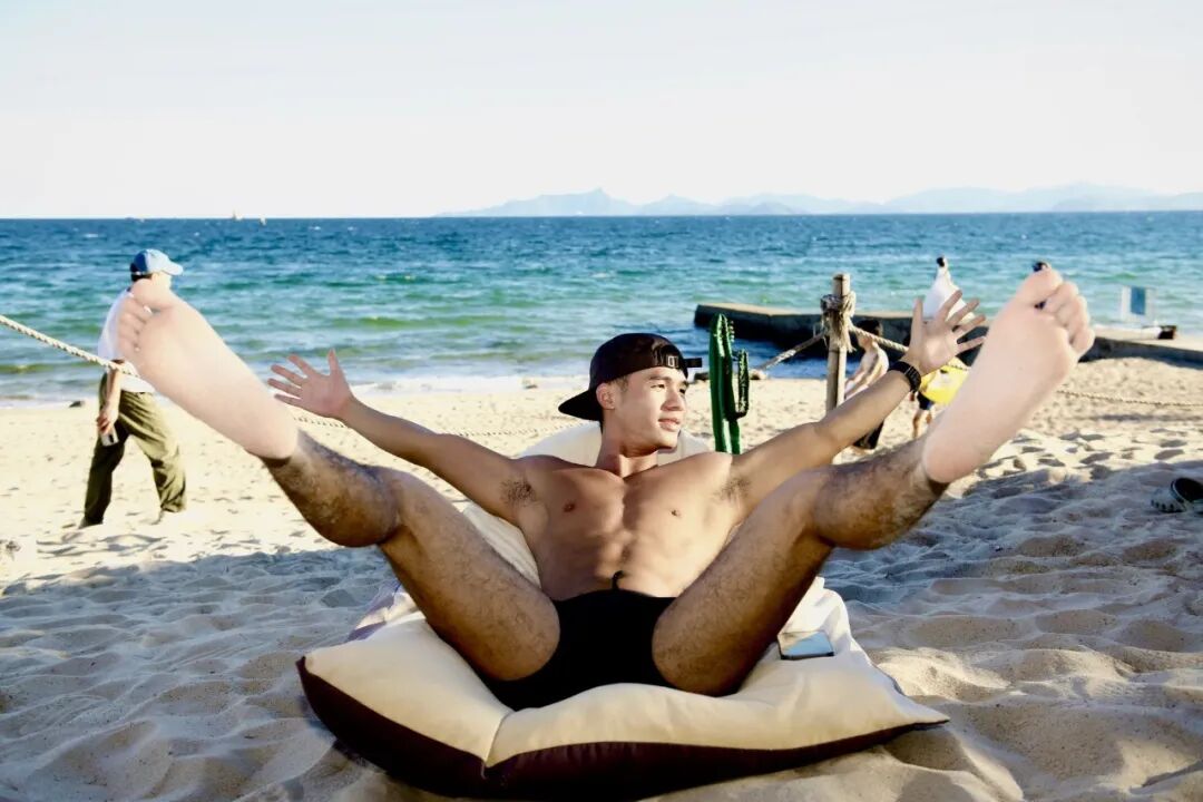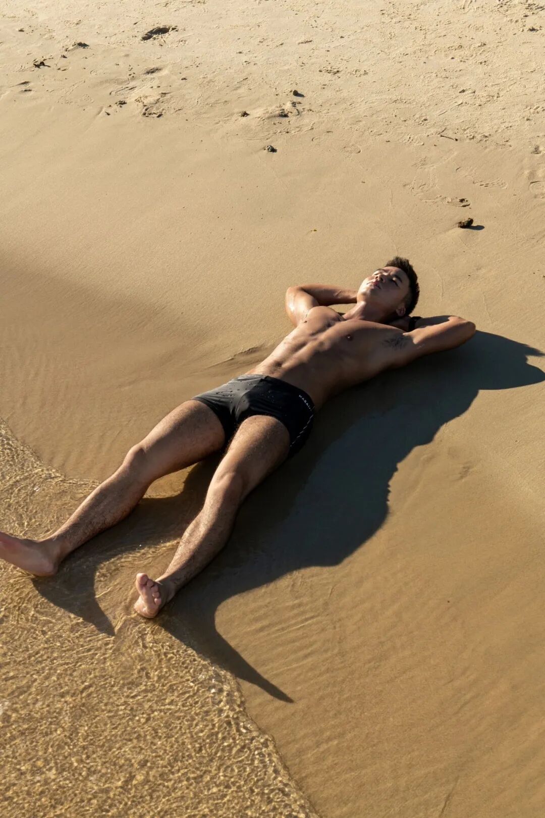 想象一下,蔚蓝的大海边,金黄的沙滩上,他只穿着简单的紧身泳裤,惬意地躺在那里,整个人完全放松下来,好像和海风、阳光、沙滩融为了一体。光是看照片,都能感受到那种 “沉浸式享受海边时光” 的惬意,让人忍不住跟着想深呼吸一口海边的新鲜空气。