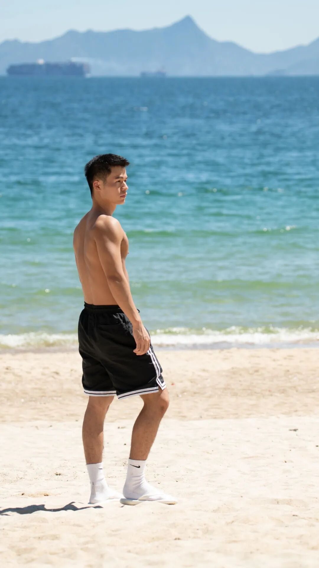 有一次他穿着运动短裤,上身光着,露出结实的手臂肌肉,在海边慢慢散步,脚上还穿着一双白袜,阳光洒在他身上,白袜和黑皮形成鲜明对比,评论区里好多网友都在说 “这个白袜造型也太可了”!
