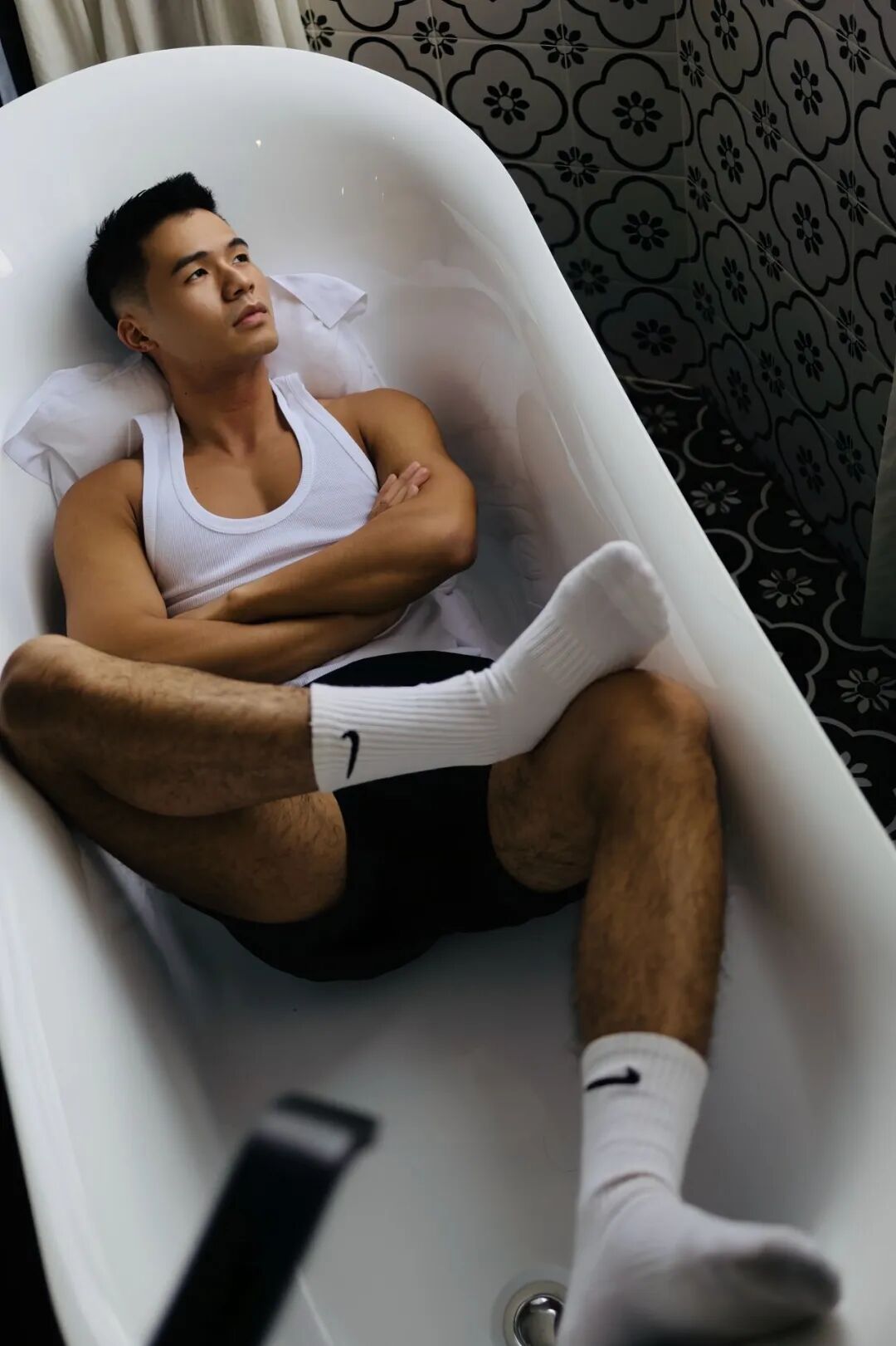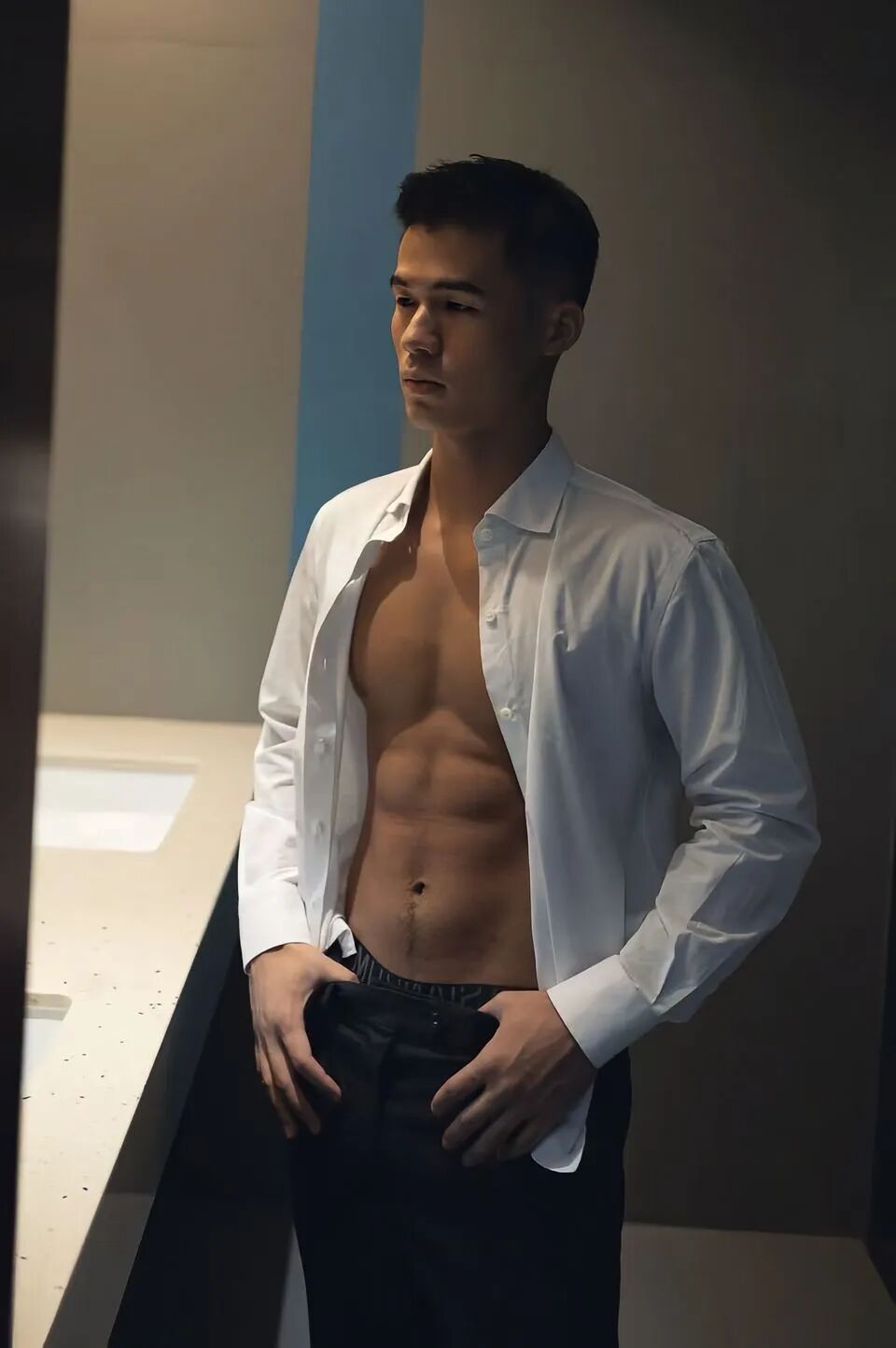 更有意思的是,他身上的毛发特别旺盛,茂密的腿毛顺着小腿线条自然生长,腹部还有一条细细的腹毛,就像天然的 “男性荷尔蒙印记”,一点都不突兀,反而让他的男性魅力更突出了。