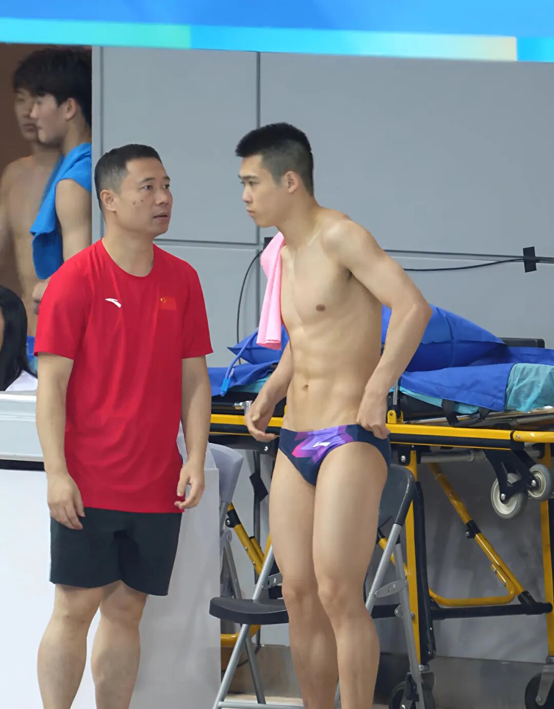 高台上的少年微微垂首,专注聆听台下的提示。教练简短指点几个动作要诀,只见他认真颔首。教练突然用力拍了拍他结实的肩膀臂膀,随即捏了两下,如同在验证一件绝世珍宝的坚实成色。台下传来零星笑声,少年自己仿佛浑然不解其意,只是唇角自然地微微上扬。他脸上坦荡而纯净的笑容,却将观众席里低沉的私语声浪,奇异地融化了。