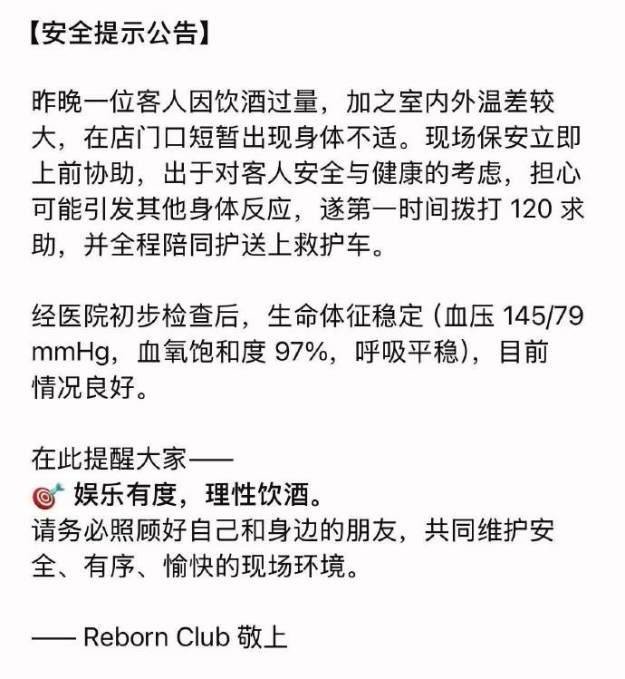 当晚那位客人只是饮酒过量,加上夜店门口温差大,出现了短暂的不适。保安第一时间拨打了120,并陪他去了医院。