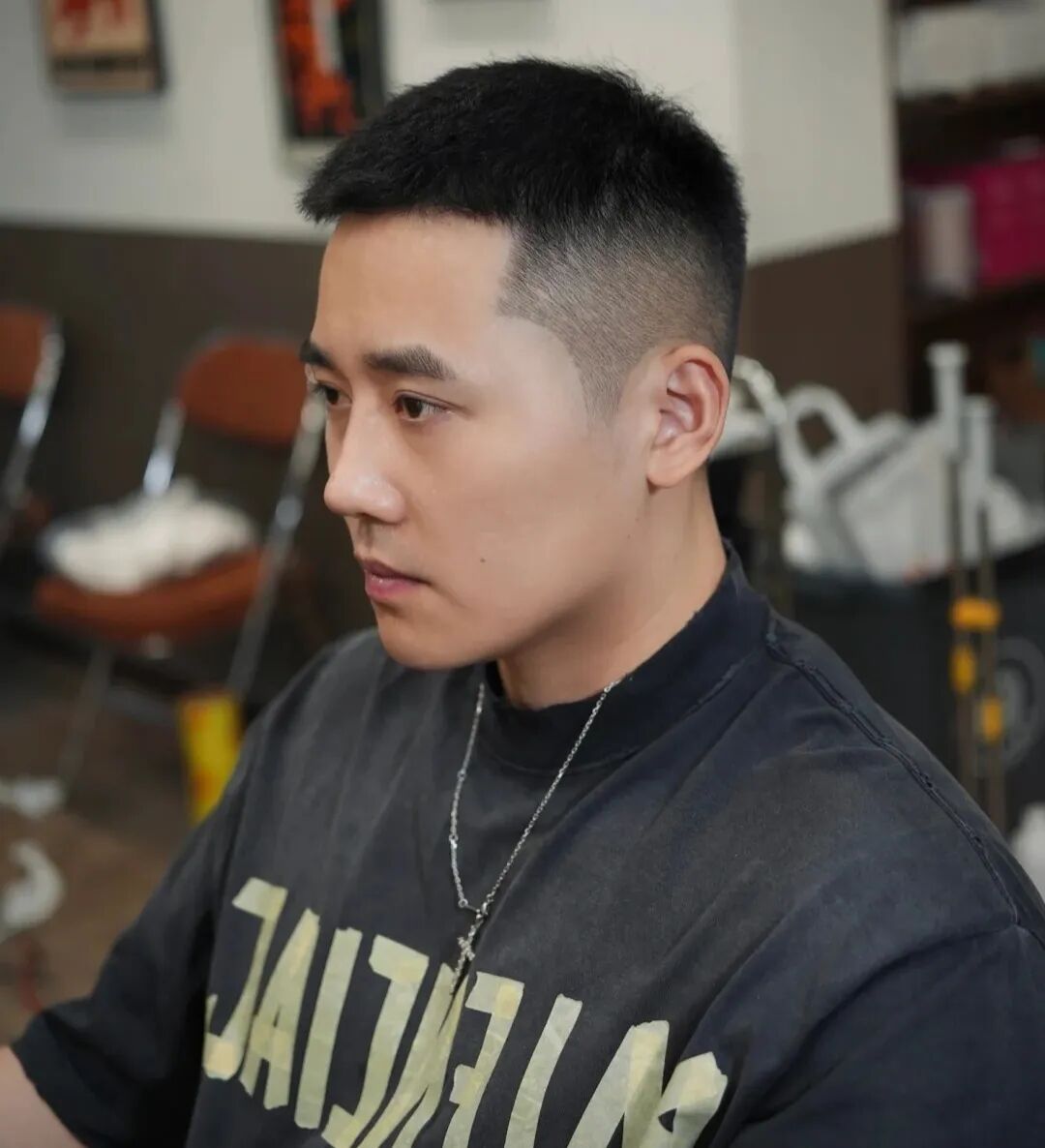 要是你嫌每天打理头发麻烦,又想显得精神,寸头绝对是最优解。粗硬发剪短后不会软塌塌地贴在头皮上,反而能保持清爽的层次感,还能悄悄修饰头型——头大脸宽的男生剪完,视觉上直接显瘦一圈,而且夏天剪完巨凉快,再也不用体验“头发闷出汗”的尴尬,走在街上都自带“干净少年感”。第三款:前刺发型别以为粗硬发只能走成熟路线,前刺直接帮你解锁“活力男孩”模式。把头顶头发剪得长短适中,再用发蜡把发尾抓出向上的小刺,粗硬的发质刚好能让“刺”立得稳稳的,不会软趴趴地塌下来。搭配两边渐变的推剪,既能显高颅顶,又能让五官更立体,上学、打球、逛潮牌店都超搭,回头率直接拉满!