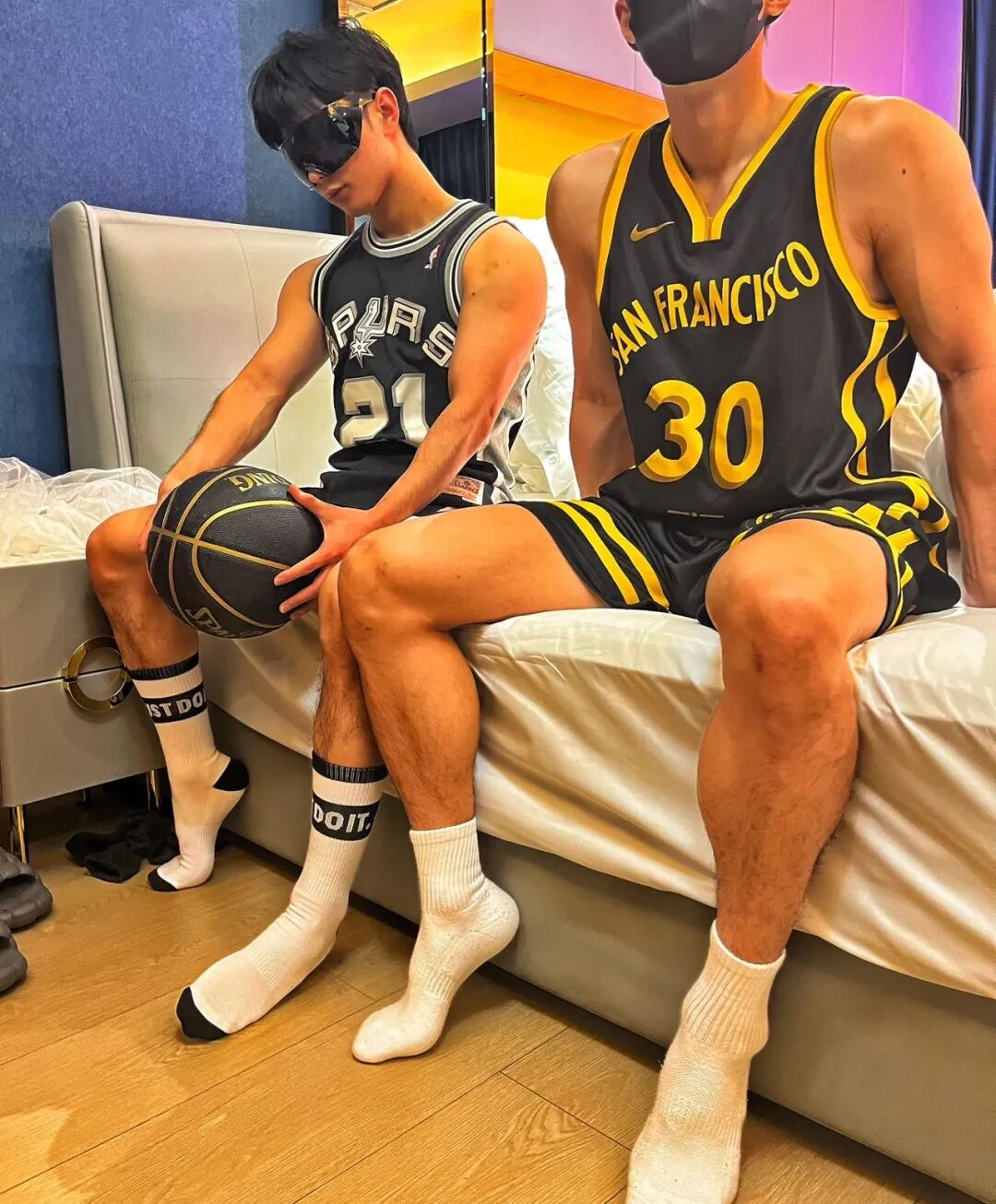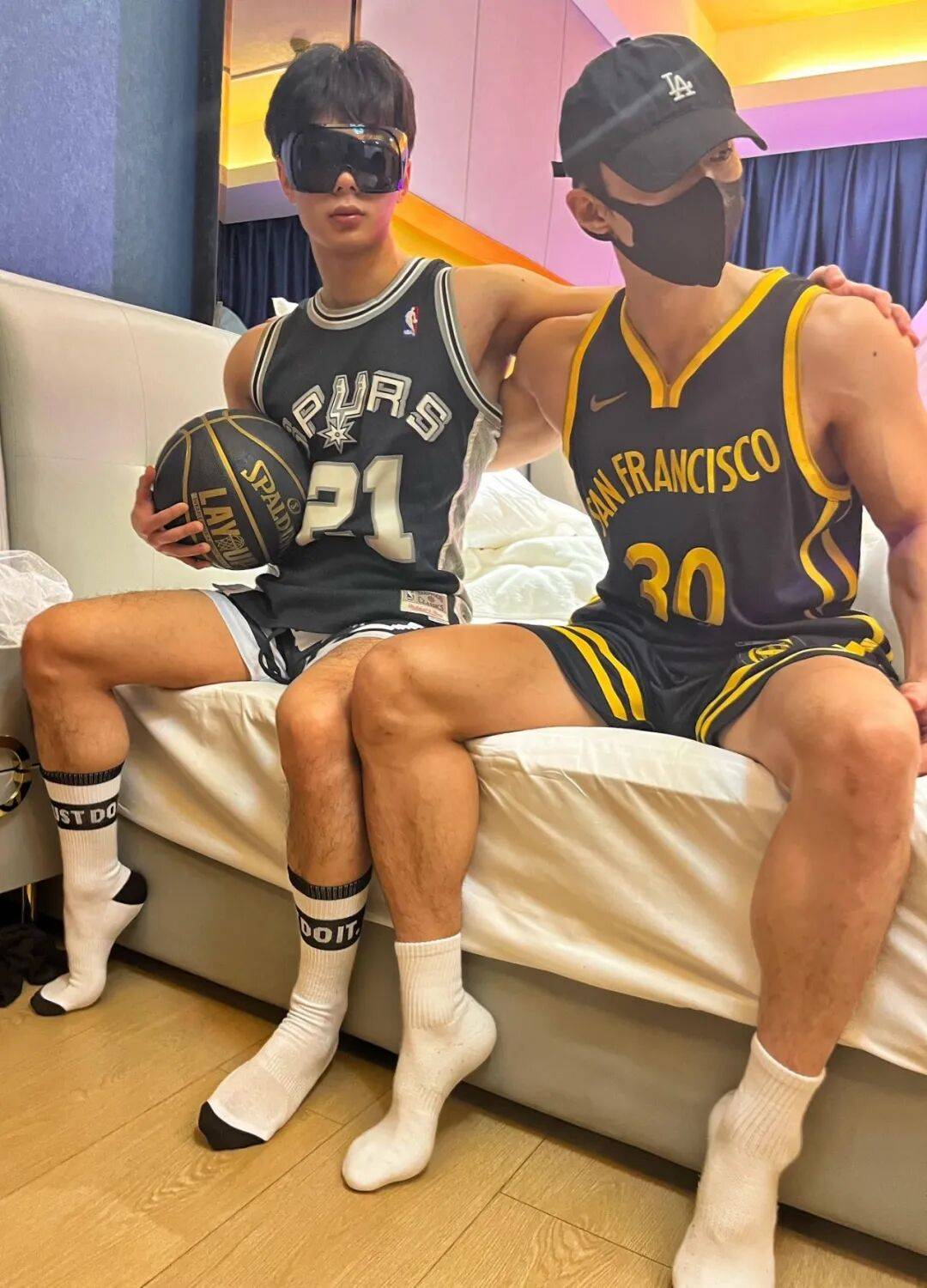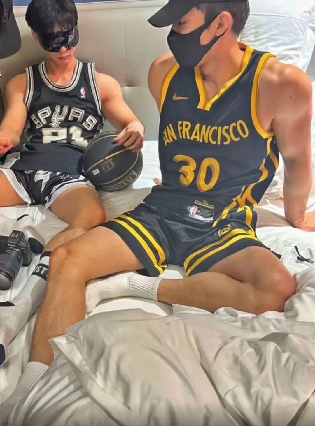 最近同时被曝光的还有这组体育生的酒店照片,这画风充满了「某爷风」,无论是球服,还是口罩、眼罩,emmm……死去的回忆又杀回来了!难怪这周网友们都在疯狂追更