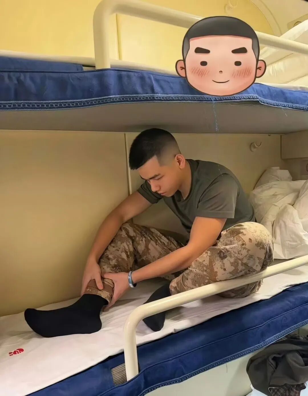 有网友在出去玩的时候,在火车上遇到了邻座的兵哥哥,然后偷拍了一下……寸头小哥男人味儿十足,而且还穿着黑袜!这个躺下去开胯的姿势也超级man了!