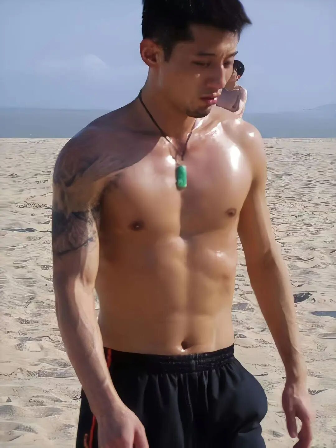 张继科在沙滩上呈现的姿态,无异于造物主对男性力与美的一次炫技式雕琢。炽烈的阳光毫无保留地亲吻着那精心打磨的古铜色身躯:饱满如山峦的胸肌,轮廓如甲胄般分明的巧克力状腹肌,粗壮有力、筋腱毕现的双臂,足以激起无尽探索欲的结实大腿……海风拂过肌理的沟壑,浪花温柔地吻着足踝。胡渣在光线下闪烁如金砂,汗水与海水交融,折射出生命原始的耀眼光芒。