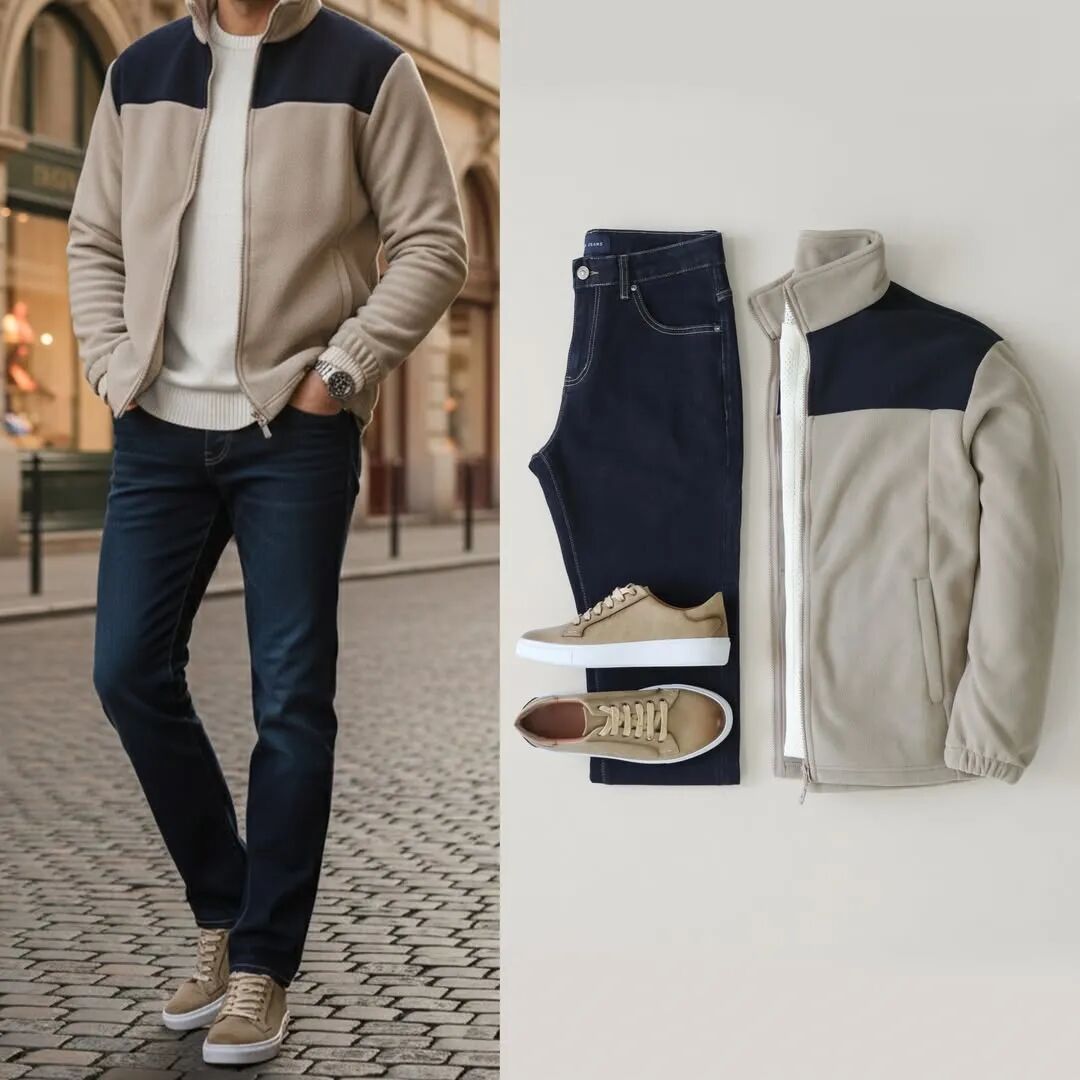 搭配1:撞色夹克+米白色毛衣+黑色牛仔裤+驼色板鞋