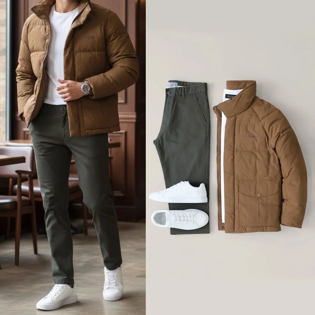 搭配2:驼色棉服+白色T恤+军绿色西装裤+白色板鞋