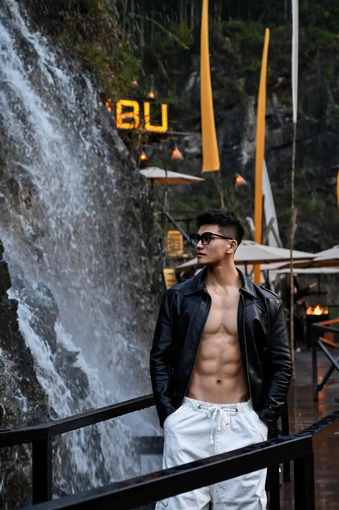 他也可以是身处自然秘境的探险家,在瀑布、山石与木桥间,将硬朗的腹肌与原始的自然之美并置,白色的宽松长裤,搭配敞开的黑色皮夹克,这不是简单的穿搭,这是他与世界对话的方式:赤诚、自由、无畏。