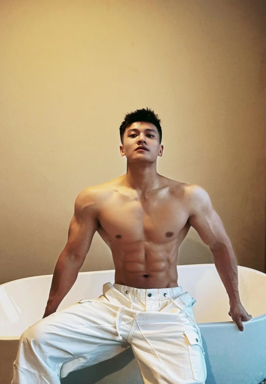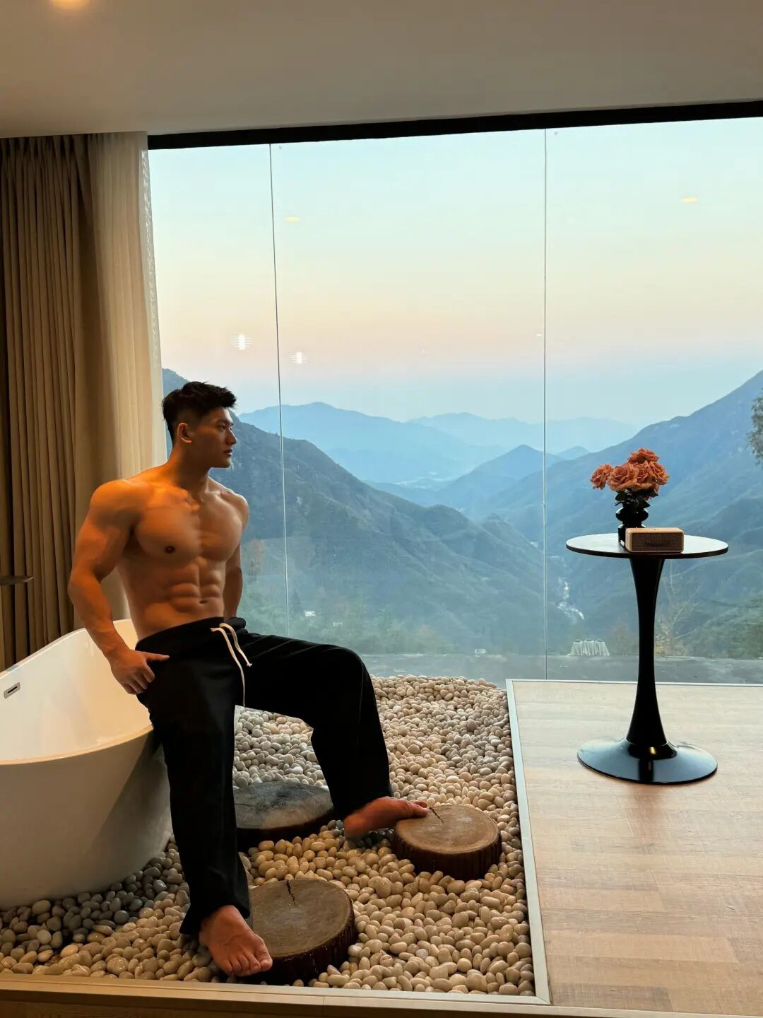 从健身房中挥汗如雨的刻苦,到对着镜子记录下的点滴进步,他的每一块肌肉都在讲述着一个关于坚持和突破的故事。这种自律,让他随时随地都能成为风景——无论是在浴缸边慵懒地休憩,还是在山景落地窗前沉思,他的存在本身,就是一幅充满张力的画作。
