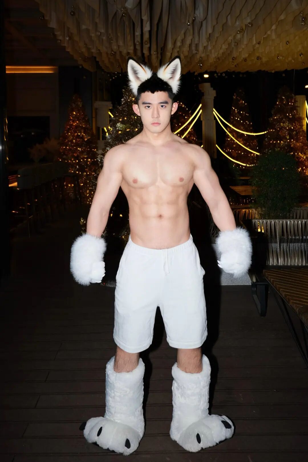 这种“可爱”并非单纯的幼态,而是一种温润如玉的气质。无论是在宝可梦公仔环绕下的生活照,还是戴着萌系兽耳的趣味穿搭,他都展现出一种极高的时尚包容度。这种天生的亲和力,让他在硬核的健身圈里显得格外温柔,仿佛他不是在冰冷的器械中苦练,而是在雕刻一件充满活力的艺术品。