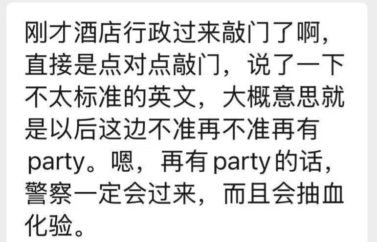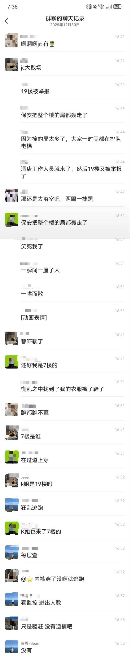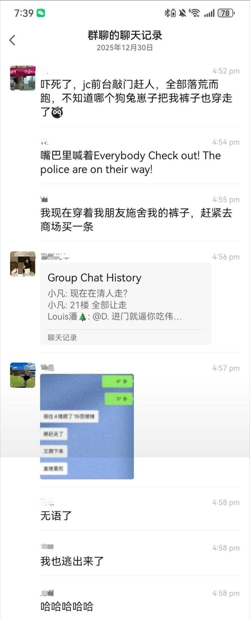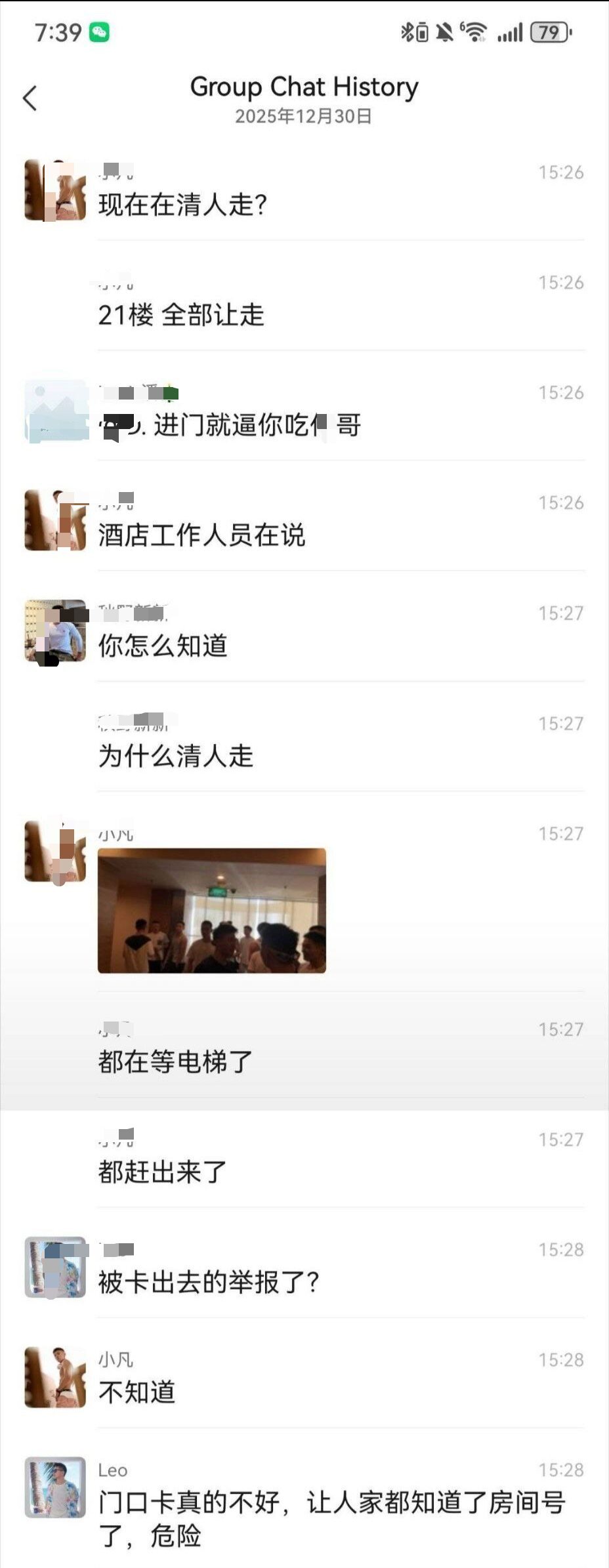 群里陆续有人发现场视频,看着真挺狼狈的。有人慌慌张张收拾东西,衣服鞋子扔得满地都是,还有人说自己刚洗完澡,浴巾都没来得及裹好就被催着离开。乌泱泱一群人挤在走廊里,有的在找同伴,有的在联系车,那股仓惶劲儿,完全没有跨年该有的轻松。