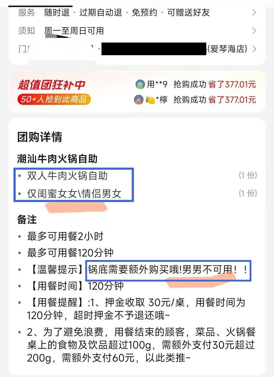 潮汕牛肉火锅自助套餐禁止男男顾客使用?网友怒批老板短视