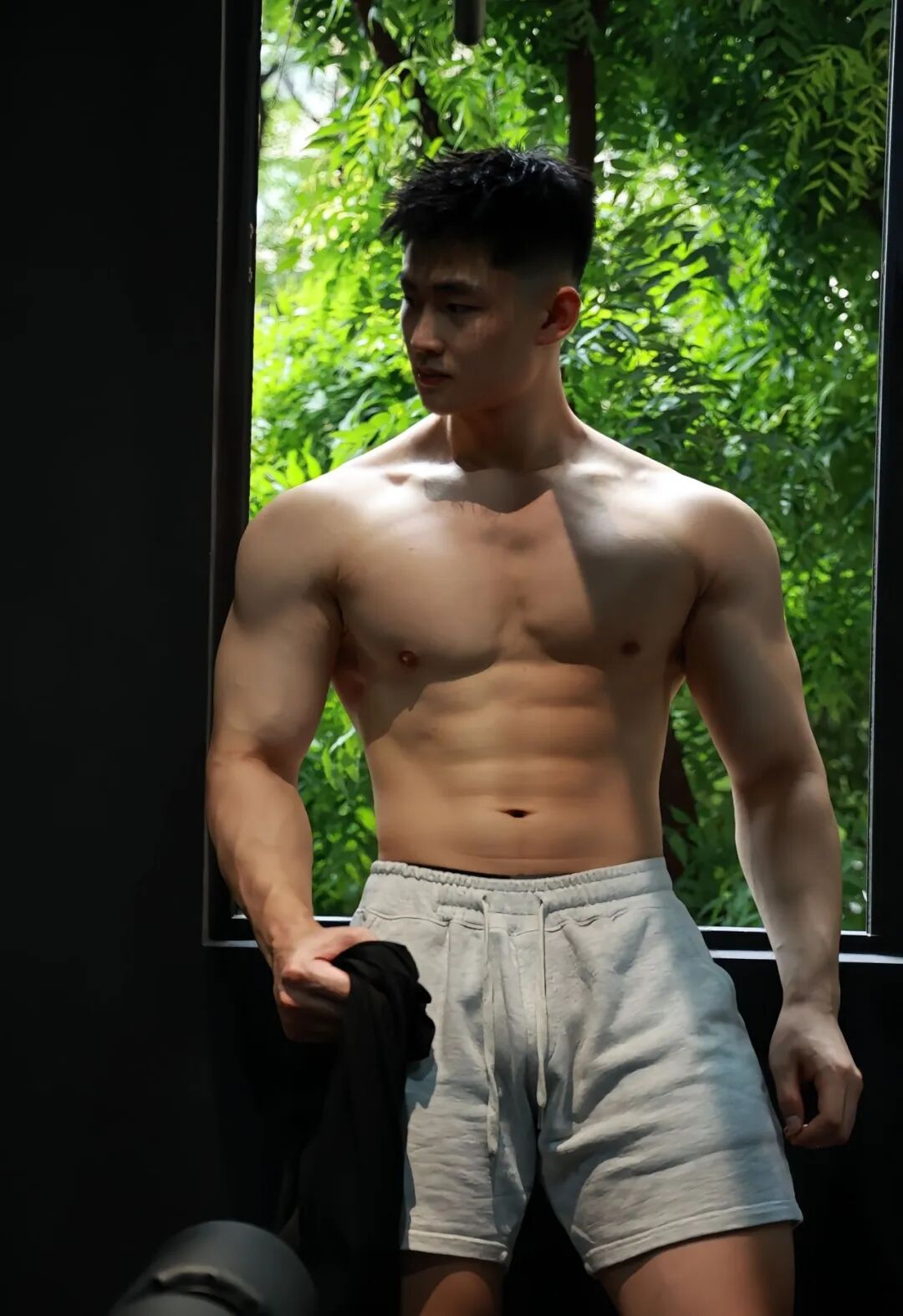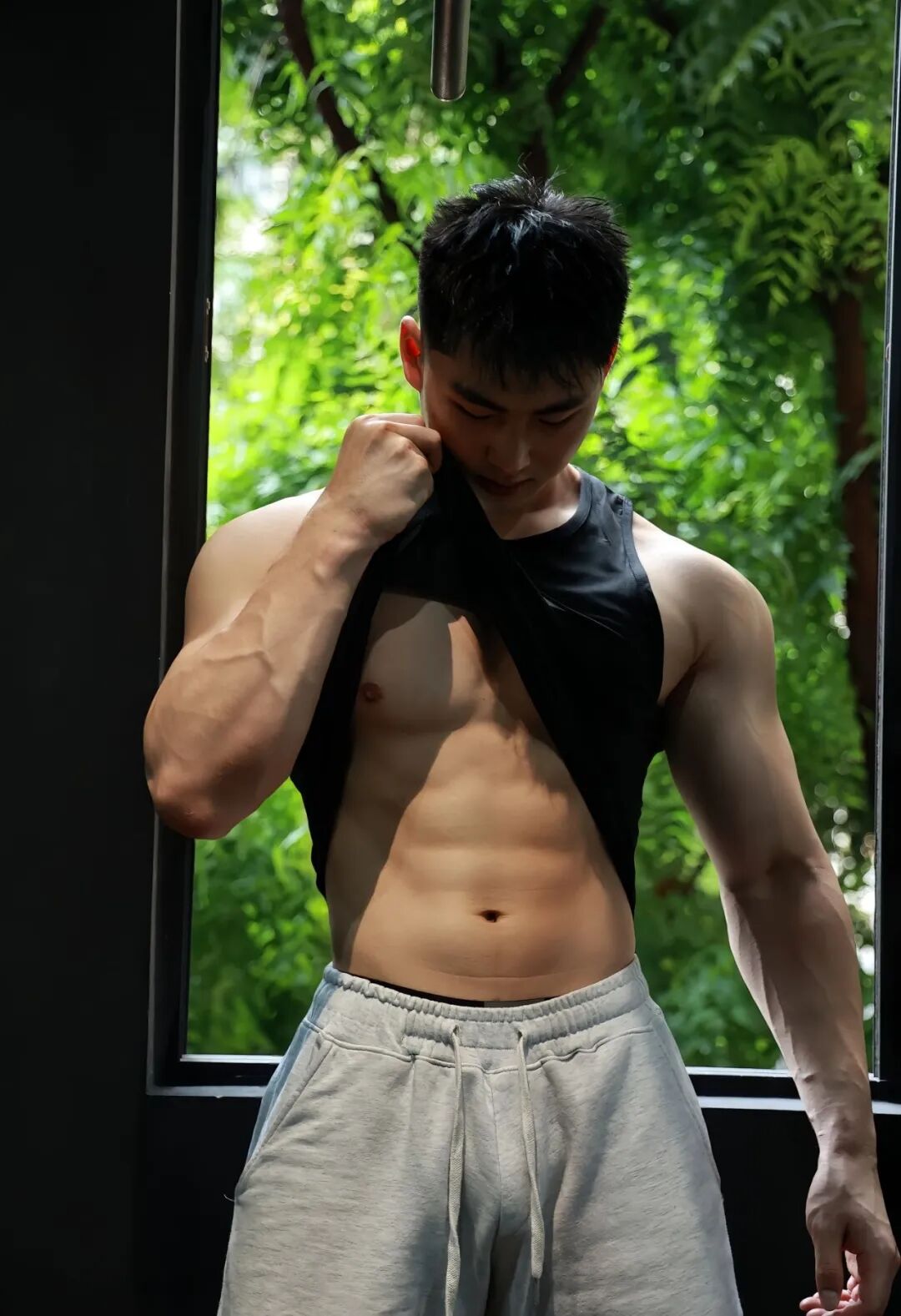 特别是换上那条灰色运动裤时,低调的包裹反而更凸显出起伏的肌肉轮廓,男性魅力值直接拉满!
