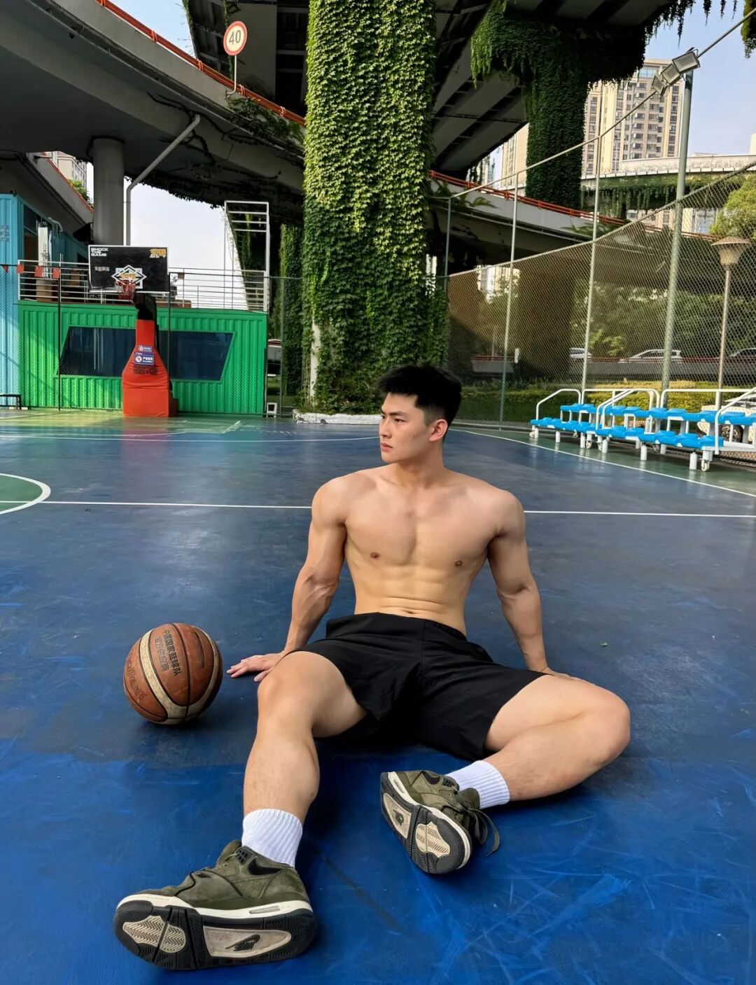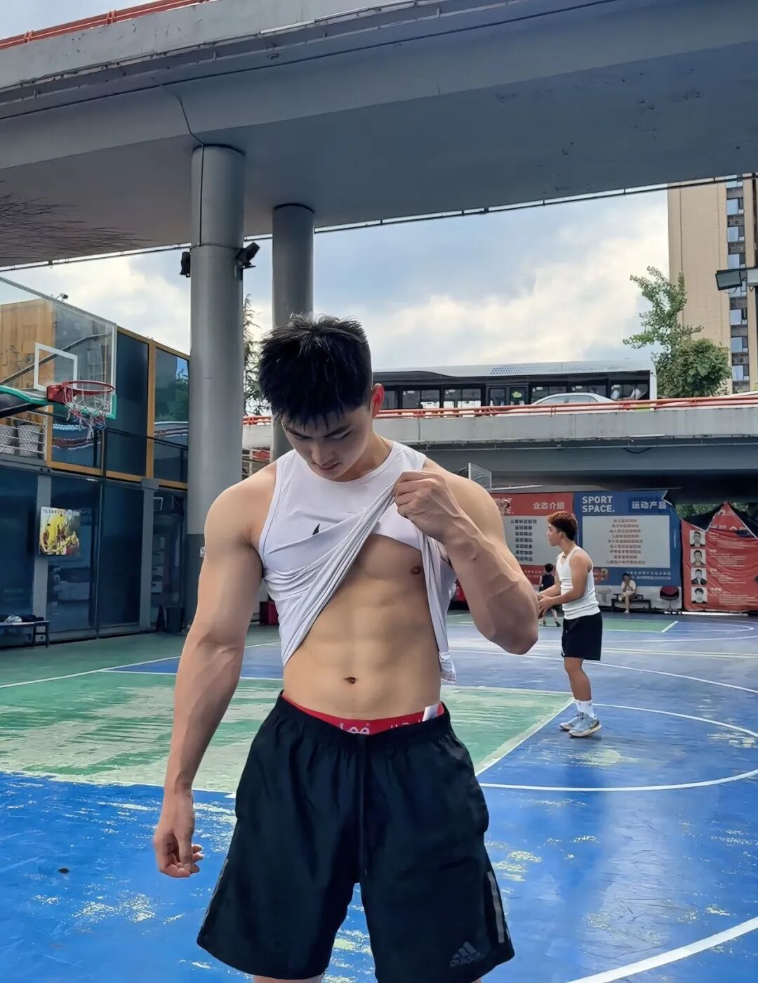 北体大毕业的粗壮肌肉小哥,篮球场大方撩衣呀!